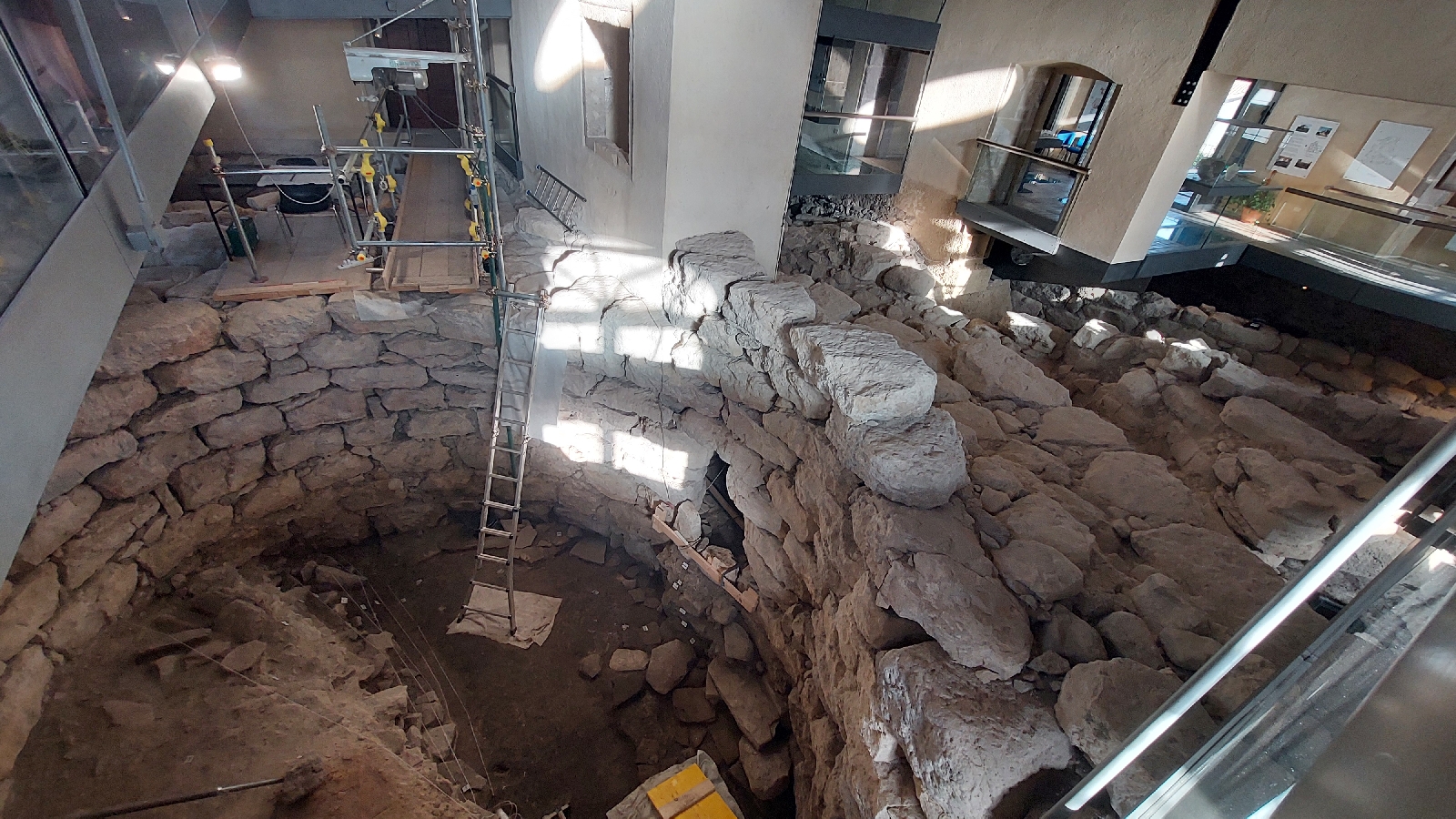 Vstopili smo v osrednji stožčasti stolp, ki v svojem osrčju skriva stalen vir pitne vode. Stolp je včasih vseboval tri nivoje sob, do katerih so vodile spiralne ozke stopnice.